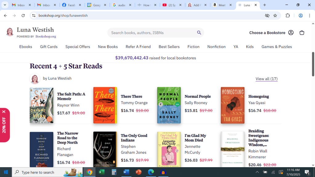 All of Bookshop.org is free shipping through July 11, and my book is available there cheaper than Amazon! I even created a storefront to share my favorite books. Here’s a link to the storefront, and the link directly to Meet Me at the Ruins. Happy reading!